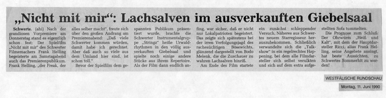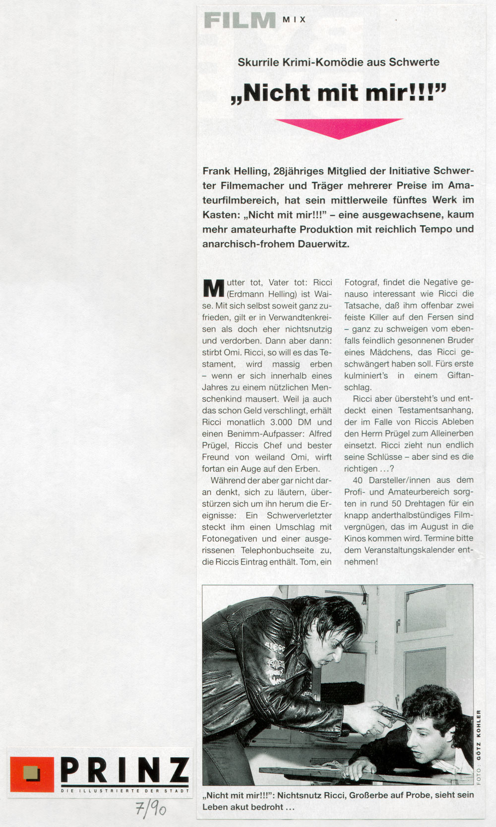 „Nicht mit mir!!!“ war eine NoBudget Produktion, die von August 1989 bis März 1990 gedreht wurde. Mit dem minimalen Budget von etwa 15.000,- DM (ca. 7.700 €) entstand in dieser Zeit eine turbulente Komödie, die damals durch Tempo, Spielwitz und groteske Szenen bestach.